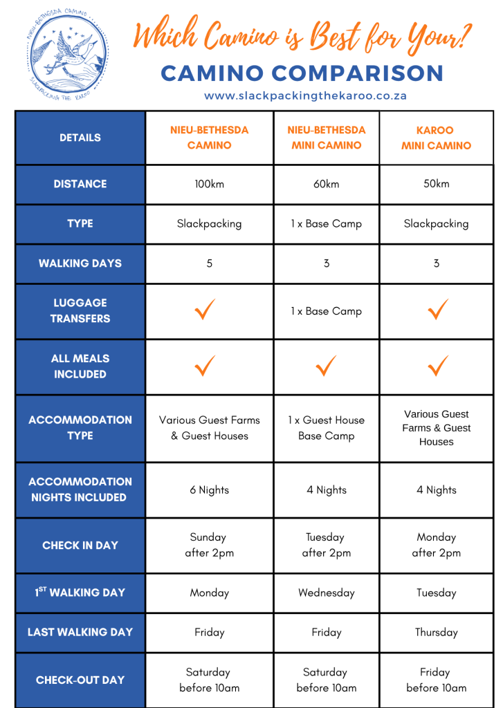The 60km Mini Camino covers approximately 20km per day over three days, and it has one defining structural difference from the big Camino: a single base camp. You stay at a Guesthouse in Nieu-Bethesda every night. You walk out each morning, you walk back each afternoon, and your vehicle doesn’t move. No packing up and moving. No new room to navigate. Just the walk.